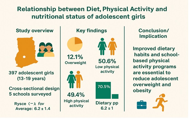 Background and Objectives: The prevalence of overweight and obesity among adolescent girls has become a major public health concern worldwide. Several factors serve as predictors of overweight: eating habits, dietary intake, and physical activity. However, the complex relationship between diet, physical activity, and nutritional status in these adolescent girls remains poorly understood. Materials and Methods: A cross-sectional study was conducted among a representative sample of adolescent girls between the ages of 13 to 19 years in the Sagnarigu Municipal. Data on dietary intake, physical activity, and nutritional status were collected using structured questionnaires and anthropometric measurements. Results: Physical activity and dietary intake were significantly associated with BMI for age (wasted, overweight, obese). However, the Dietary Diversity Score (DDS) had no significant relationship with BMI for age. Conclusions: The results suggest that the physical activity and dietary intake of the participants were significantly associated with the nutritional status of the girls. Intervention research aimed at improving school-aged adolescent girls' nutritional status should also be implemented; policies to improve the school environment and encourage students to make healthy food choices should be enforced.
